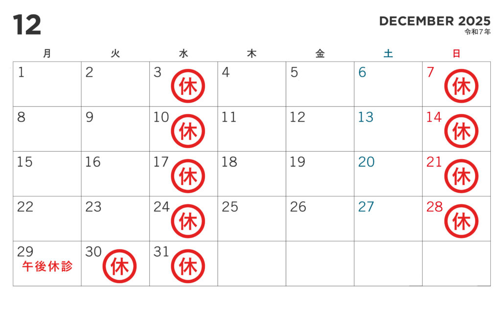 12月、1月の休診日のお知らせ 当院では下記日程を休診とさせていただきます。あらかじめご了承頂きます様、お願いいたします。 ※12/7 (日)、1/11 (日) 矯正日※12/29 (月) 大掃除のため午後休診※12/30 ~ 1/4 休診